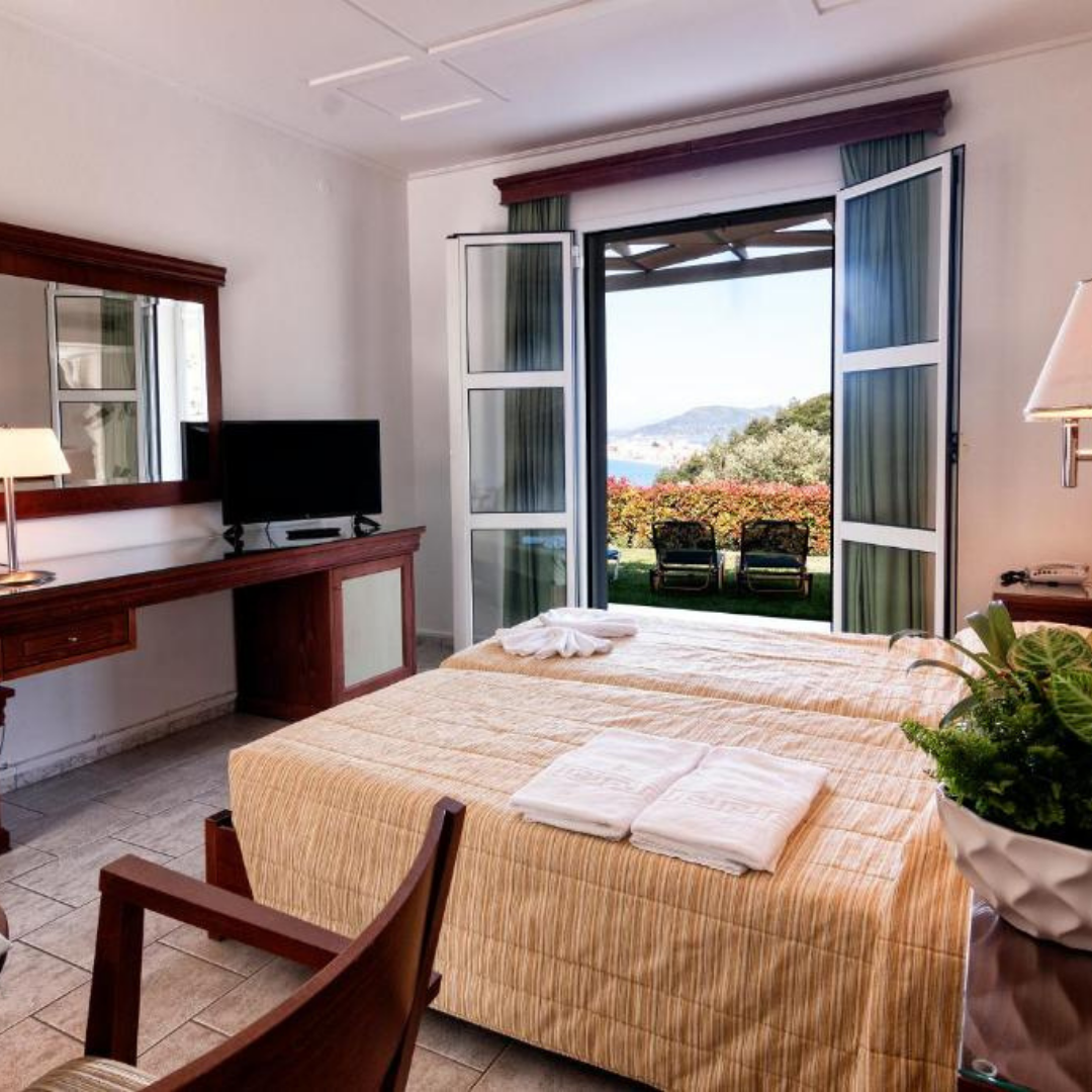 The rooms are located in the main building and in a number of bungalows. All rooms have a bath-tub/WC hairdryer, balcony or terrace, Wifi, telephone, music channel, air conditioning (24h all season), TV, fridge and twin or double beds. The rooms have either sea or mountain views.