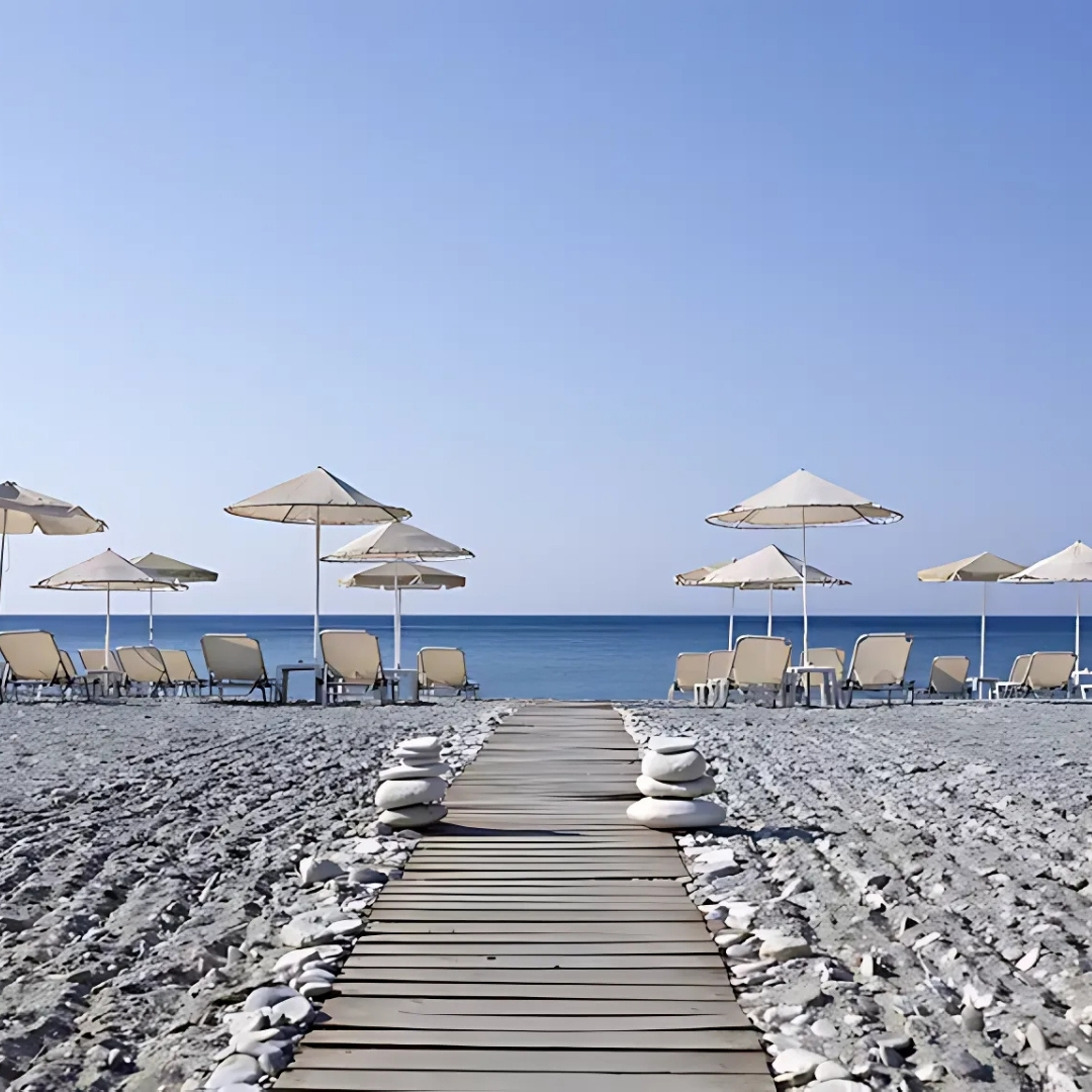 There is a fresh water swimming pool with separated children’s pool, with sunbeds, umbrellas and pool bar. There is also a bar at the beach serving snacks and a self service taverna serving dishes at noontime.