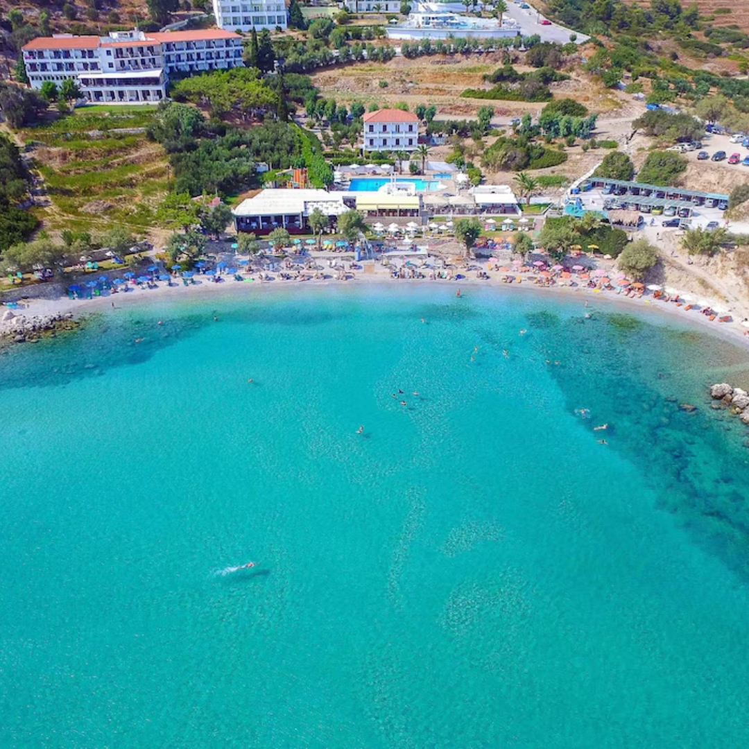 The hotel has a unique view upon the enchanting green-blue Aegean. It is a family business situated in a privileged area since Pythagorion is solely 3 km away, while the capital of the island, Vathi, and the port, 10 km. In fact, the airport is to be found, in 6 km distance while in 400 m is the bus stop. The beach is just in front of the hotel ( pebbles outside, sand inside with Blue Flag ) .