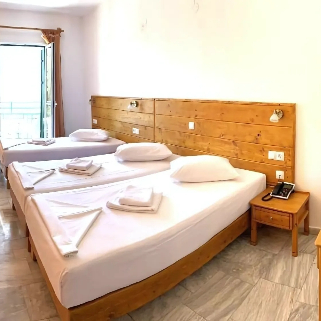 All rooms are furnished with Shower/WC, Balcony or Terrace – all with sea views, telephone, air-conditioning (high season only) Radio, TV, fridge, safety deposit box (against charge) and twin beds.